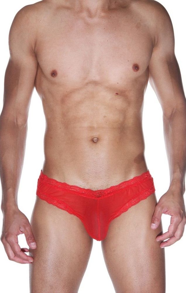 Красные мужские бразилиана из полупрозрачного легкого тянущегося материала. Кант из кружевной красной ленты.