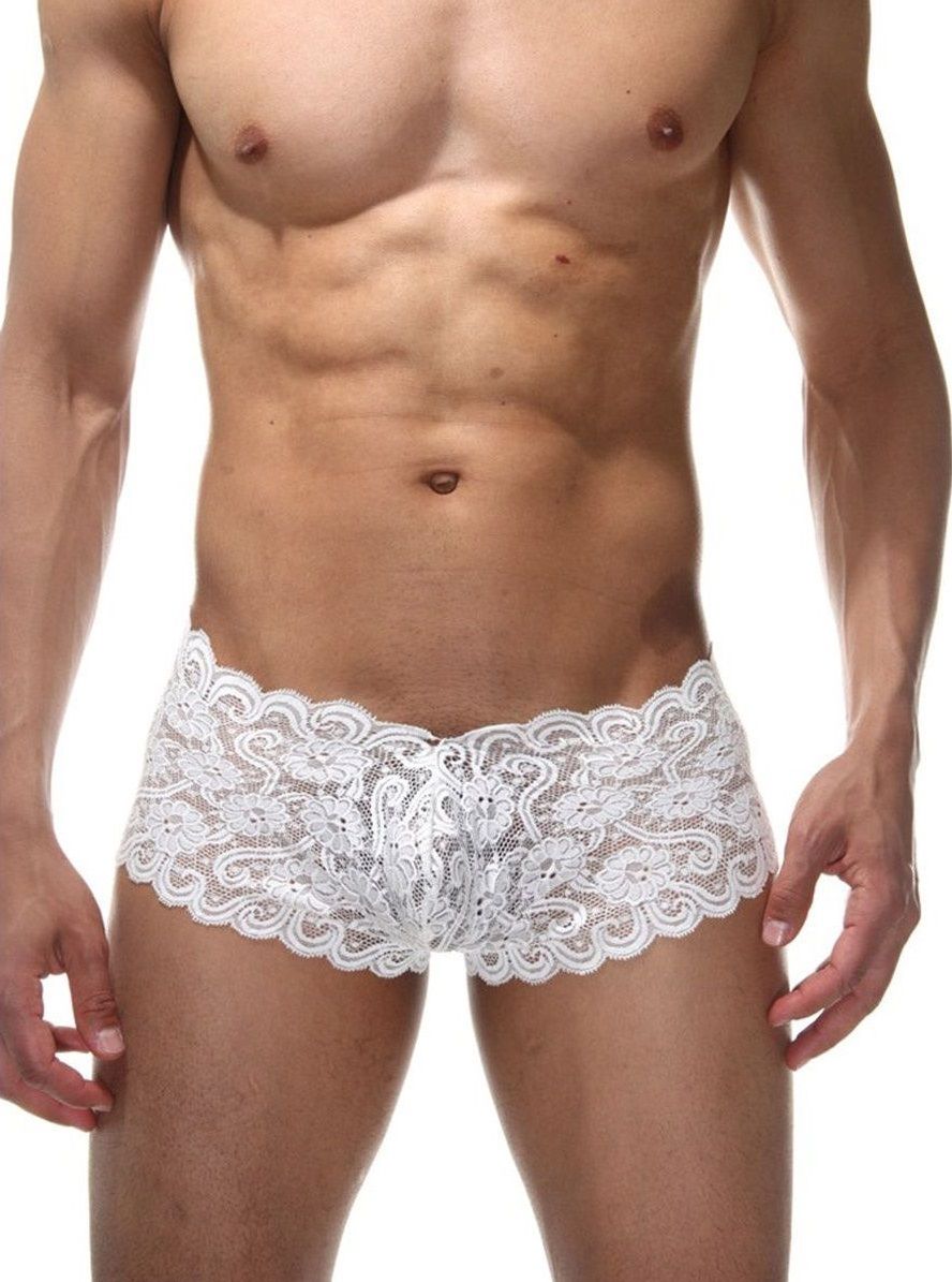 Белые мужские кружевные трусы. Сделаны из эластичной ткани, поэтому отлично подходят на любой тип фигуры. Яркая расцветка и украшение-шнуровка на ягодицах легко смогут украсить ваше тело.