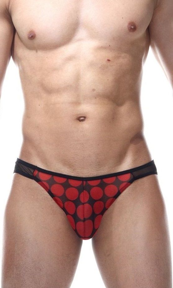 Мужские трусы-слипы, спереди из ткани в крупный красный горох, сзади из черной полупрозрачной легкой ткани.