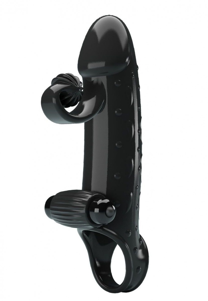 Черная вибронасадка на пенис с подхватом мошонки. Насадка удлиняет член, добавляет ему толщины. Обеспечивает партнёрше массаж клитора при глубоких проникновениях.