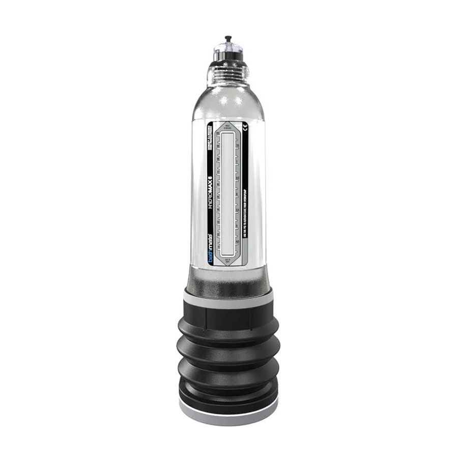 Гидропомпа является безопасным средством увеличения полового члена в домашних условиях. Подходит для мужчин с размером 16-21 см. Bathmate Hydromax8 - это уникальная гидропомпа из серии Hydromax, которая на 35% эффективнее и на 15% больше Bathmate Hercules. Она также оснащена переключателем для быстрого сброса воды и фиксации разряжения и функцией поворота колбы. Помпа абсолютно безопасна, проста в использовании и эффективна – она удобно крепится на основании пениса, не вызывая дискомфорта, и создает достаточное давление для эффективных тренировок, не требуя постоянной подкачки. В отличие от других вакуумных помп, гидропомпы Bathmate использует силу воды, поэтому его нужно использовать в ванной или душе. Благодаря гидропомпе происходит усиленный прилив крови к тканям паховой области, каверозным телам, в следствие чего увеличивается длина и диаметр полового члена. Эрекция пениса становится более выраженной и продолжительной. При регулярном использовании происходит увеличение пениса на 2-3 см.