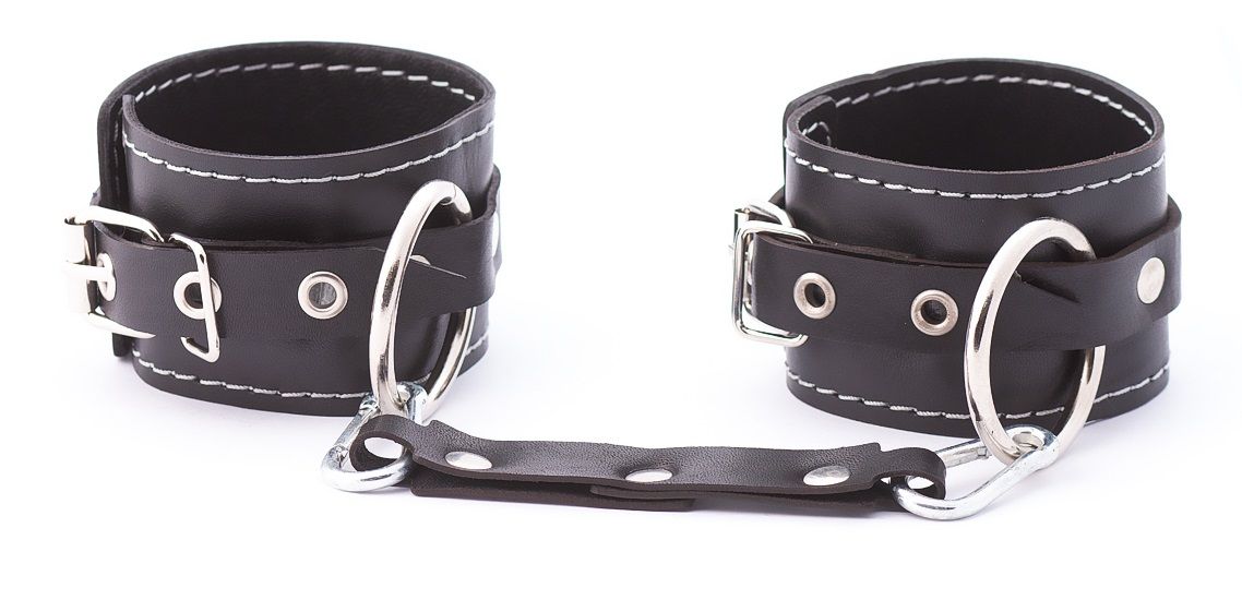 Кожаные двухслойные оковы с регулируемыми ремешками. Оковы имеют кольца для крепления и кожаную сцепку. Ширина манжет - 5,5 см. Длина манжет - 25 см.