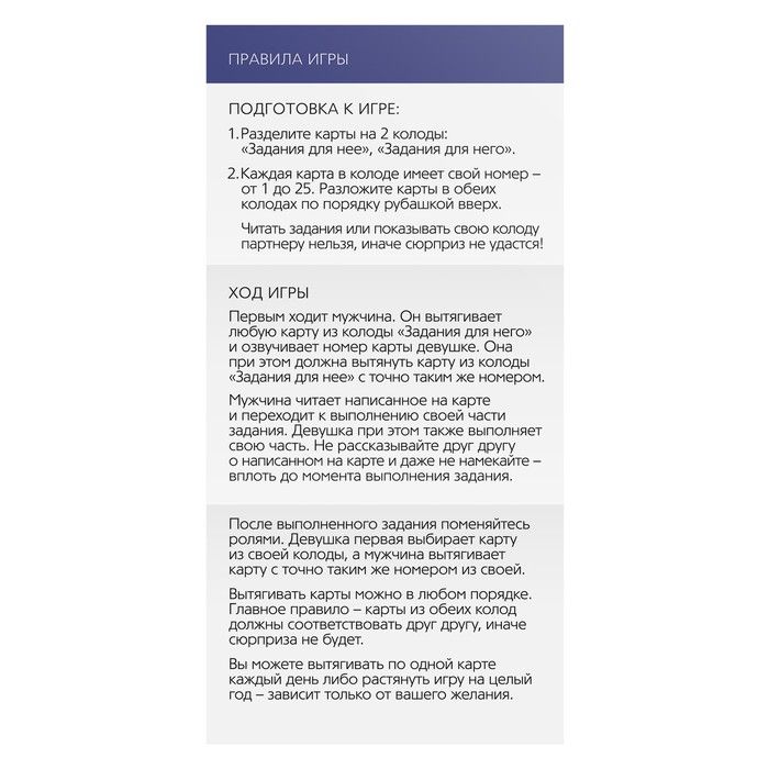 Испытайте новые эмоцииХотите сделать каждый день с любимым человеком незабываемым? Тогда пришло время перейти к романтическим действиям, которые разнообразят отношения и разделят их на: до и после. Секрет, как этого добиться, прост: вытягивайте карточки, готовьте для второй половинки приятные сюрпризы и наслаждайтесь совместным временем!Состав:• 50 карт,• правила игрыПусть романтика между вами никогда не исчезает!